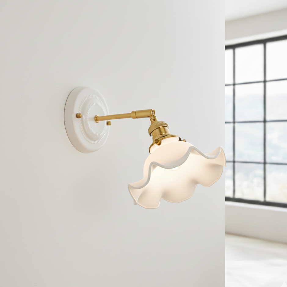 Verleihen Sie Ihren Wänden mit dieser Wandleuchte aus weißer Keramik und goldfarbenem Kupfer einen Hauch handgefertigter Eleganz . Ihr wellenförmiges, von natürlichen Formen inspiriertes Design verbreitet ein weiches, beruhigendes Licht, das Ihren Raum sofort erwärmt.