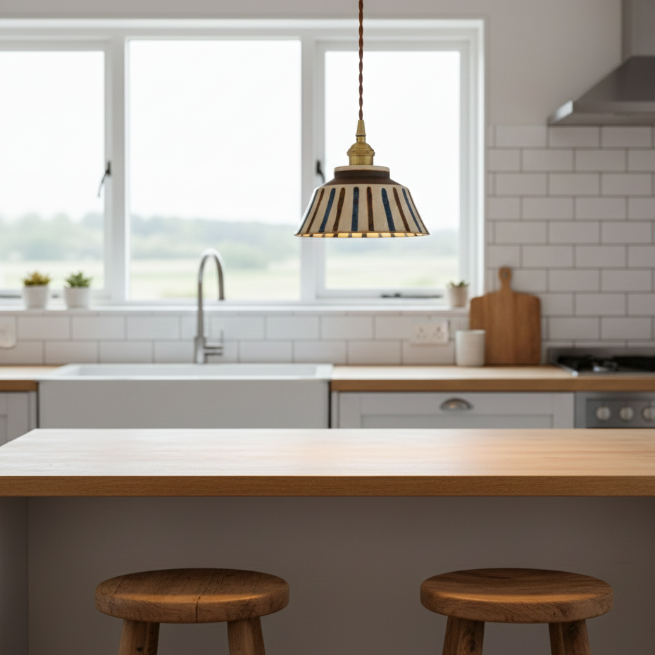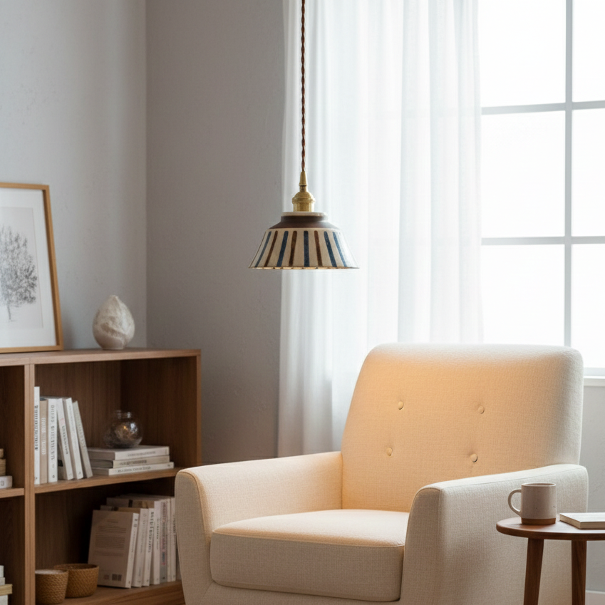 Diese Pendelleuchte besticht durch ihr handbemaltes Streifenmuster , das ihr eine lebendige und charaktervolle Note verleiht. Die warmen, natürlichen Farbtöne , kombiniert mit den bläulichen Linien und dem leicht ausgestellten Keramikdiffusor , erzeugen sofort ein sanftes und einladendes Licht. Ihre flache Form sorgt für einen breiten Lichtkegel , der den Raum angenehm und behaglich ausleuchtet.