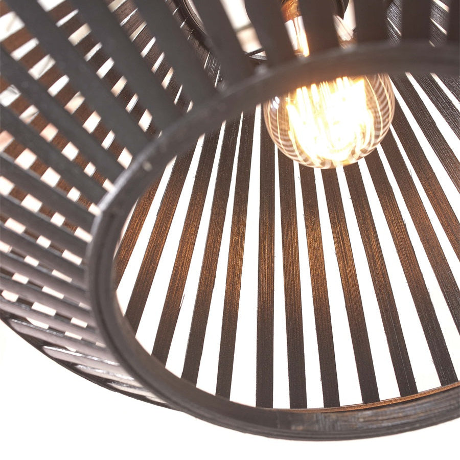 Verleihen Sie Ihrem Interieur mit der 30 cm großen Pendelleuchte Merapi eine moderne und elegante Note . Ihr rautenförmiger Lampenschirm, vollständig aus schwarzem Bambus geflochten, verbreitet ein weiches und einhüllendes Licht und schafft so eine warme Atmosphäre in einem Wohnzimmer, Schlafzimmer oder Esszimmer.
