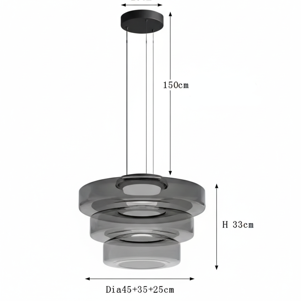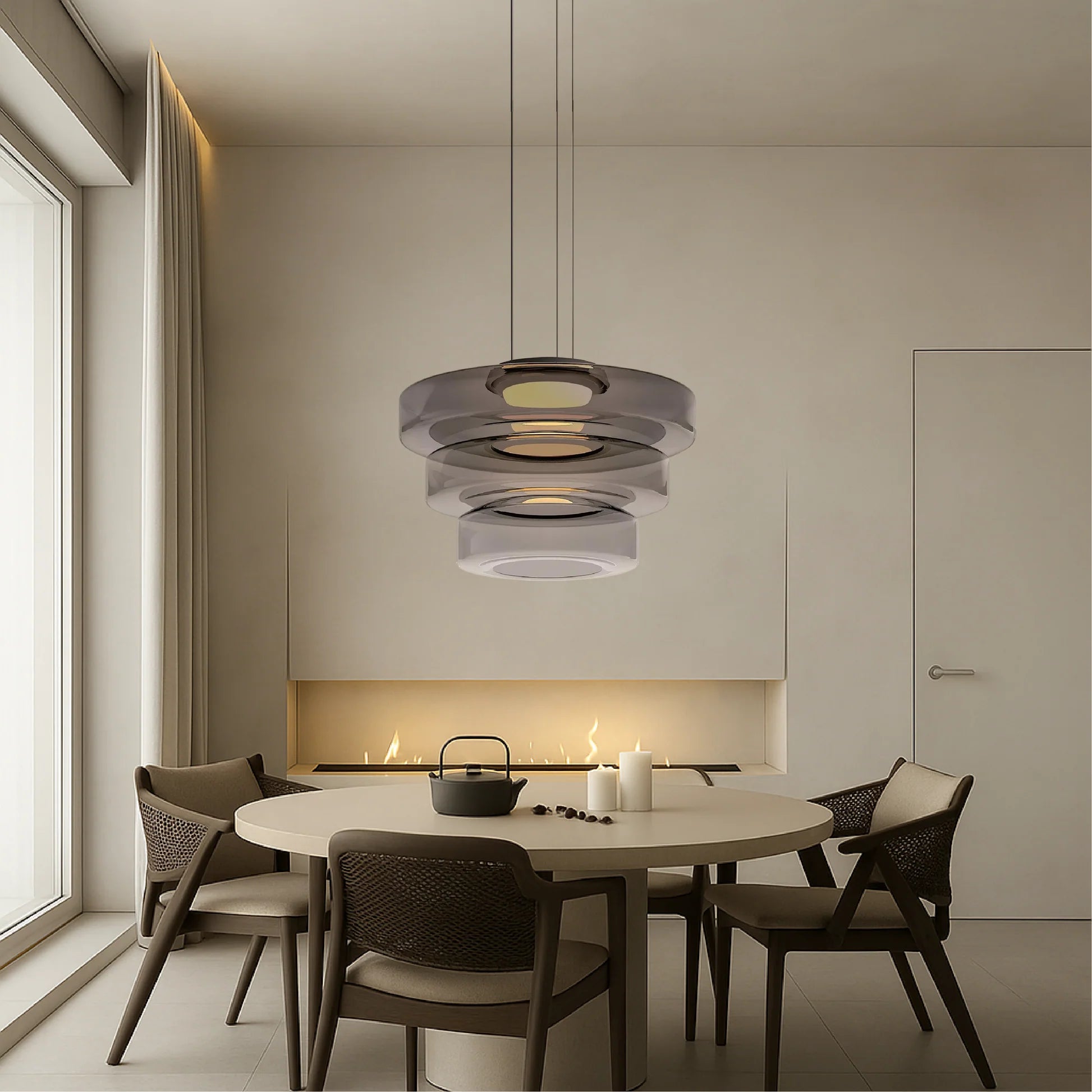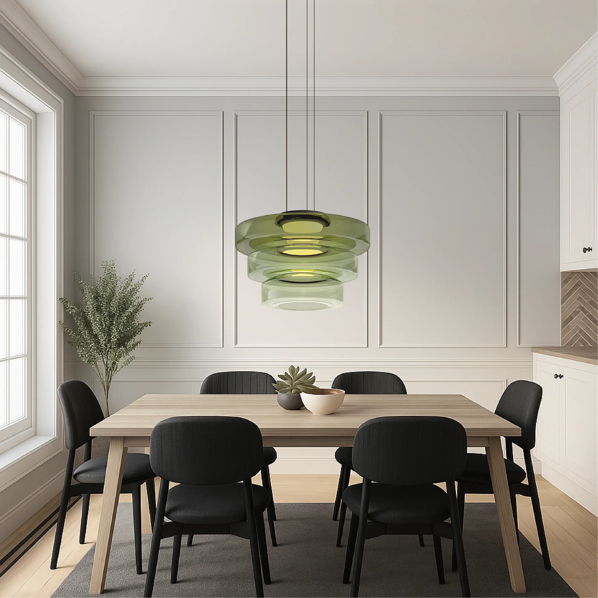 Verleihen Sie Ihrem Interieur mit dieser eleganten Glaspendelleuchte in raffiniertem Kreisdesign einen Hauch von Luxus und architektonischer Eleganz. Die sich überlappenden Ringe erzeugen ein stilvolles und luftiges Spiel der Formen – ideal über einer Kücheninsel, einem Esstisch oder in einem modernen Wohnzimmer.