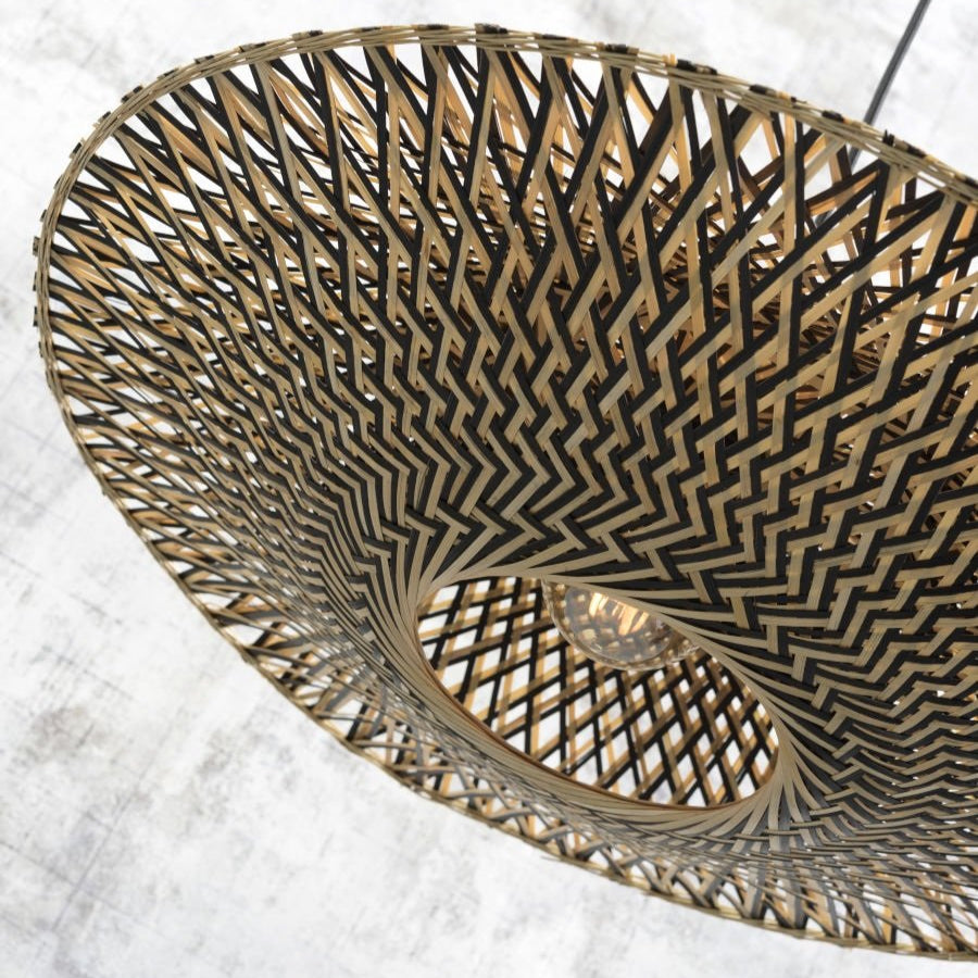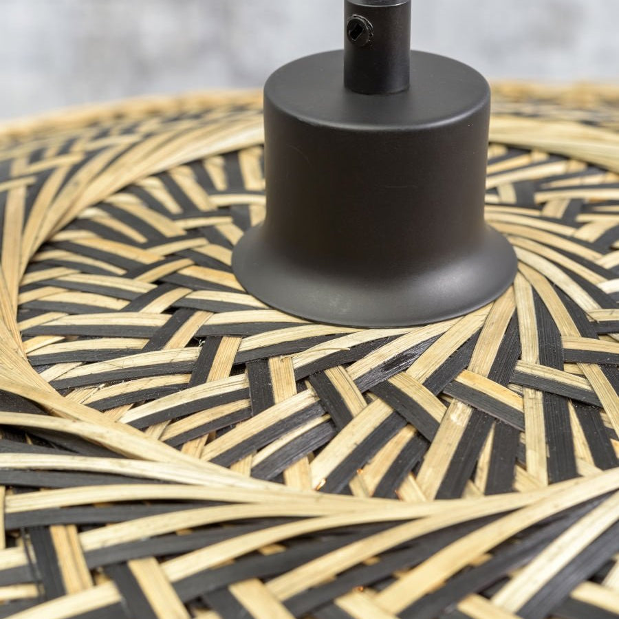 Its lampshade in woven bamboo projects subtle refined shadow play , offering a light show even when it is switched off. This luminaire combines with balance artisanal authenticity and contemporary design , to become a unique decorative piece and full of character.
