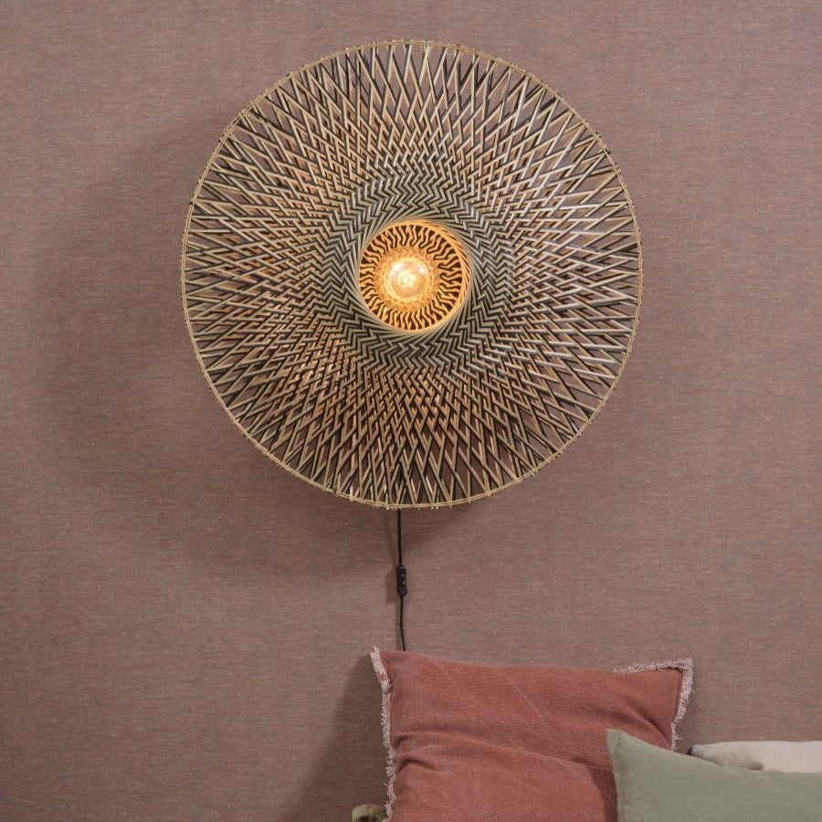 Enhance your interior with the Bali 87 cm wall light , a light with natural and majestic design . Its large round lampshade in woven bamboo, combining black and natural , diffuses a soft and soothing light , perfect for illuminating a spacious living room, an elegant bedroom or an entrance hall.