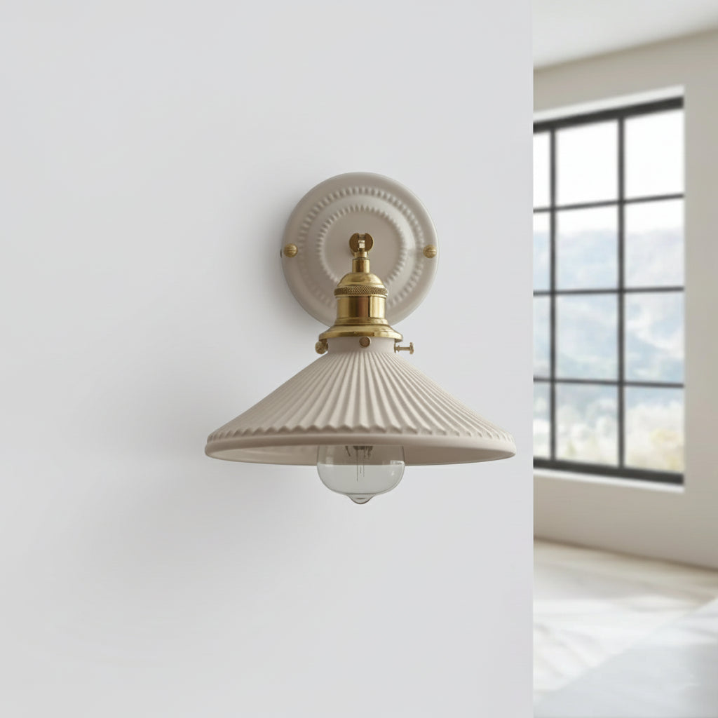 Dale un toque de elegancia atemporal a tu hogar con este aplique de pared de cerámica blanca y cobre bañado en oro. Su diseño, inspirado en el estilo nórdico moderno, combina la delicadeza de la cerámica con la sofisticación del latón para un efecto elegante y relajante.