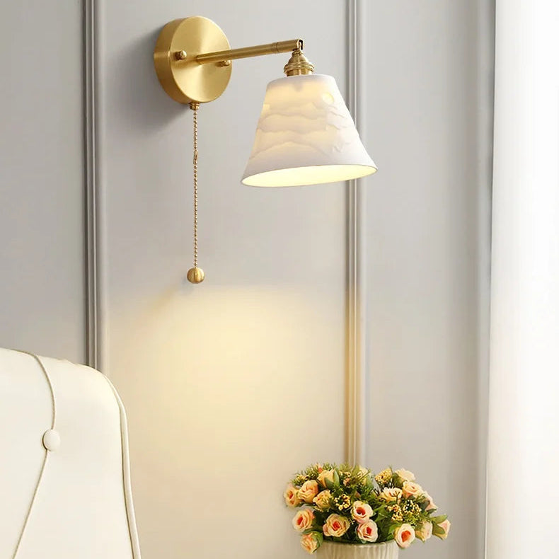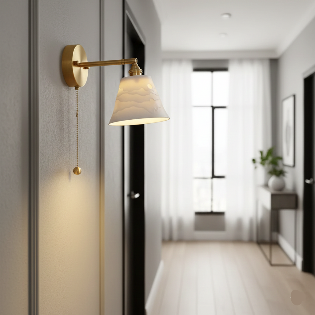 Cette applique diffuse une lumière douce et chaleureuse, créant immédiatement une ambiance paisible et accueillante. Son abat-jour en céramique légèrement façon cloche, marqué d’une délicate ondulation, laisse la lumière s’écouler en douceur vers le bas, formant une atmosphère harmonieuse et apaisante, particulièrement agréable en soirée. Sa silhouette élégante apporte un charme vintage discret, à la fois intemporel et cosy.