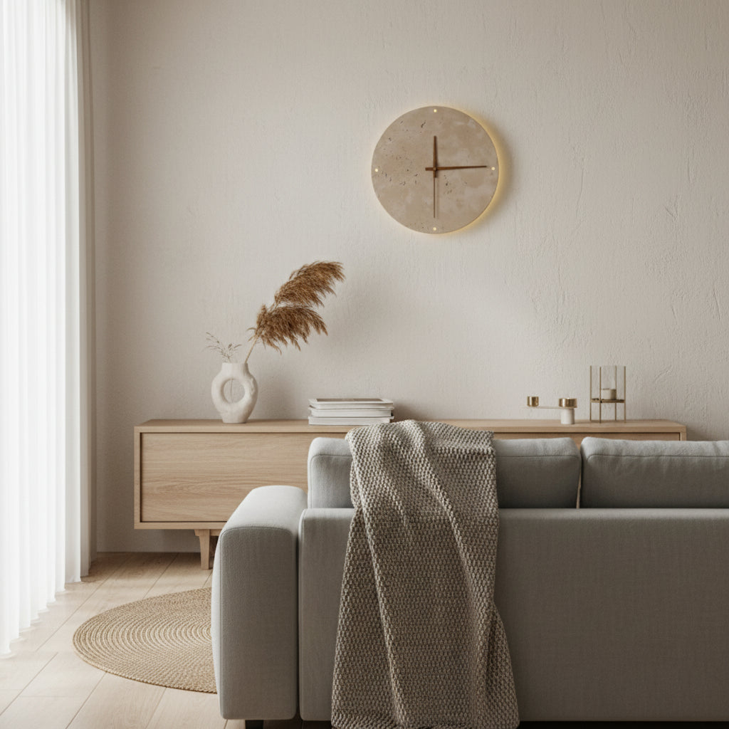 Alliez design raffiné et fonctionnalité avec l’Applique Murale Horloge en Pierre Naturelle. Conçue en travertin authentique, cette pièce unique associe l’élégance d’une applique murale à la praticité d’une horloge murale, apportant un charme intemporel à votre décoration.