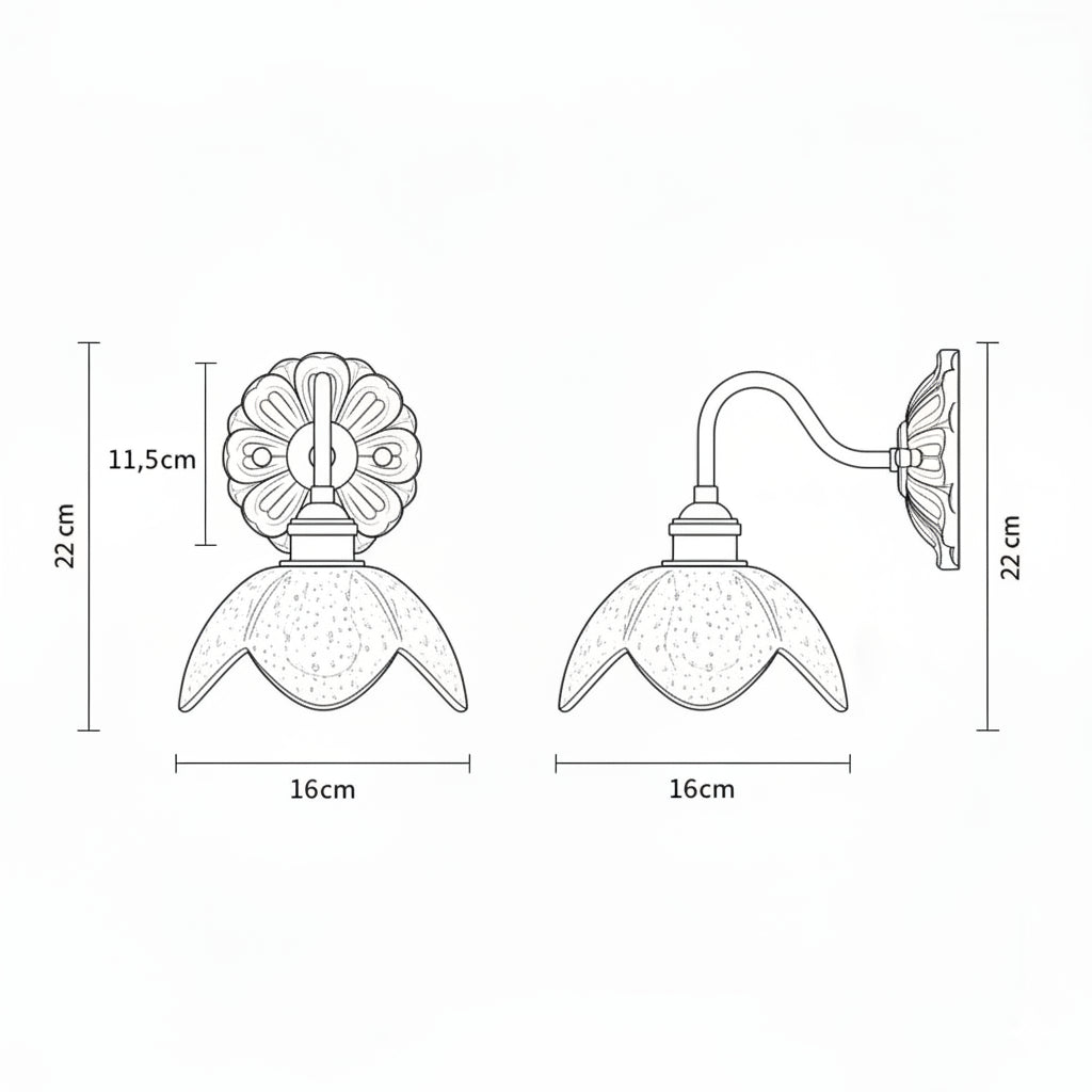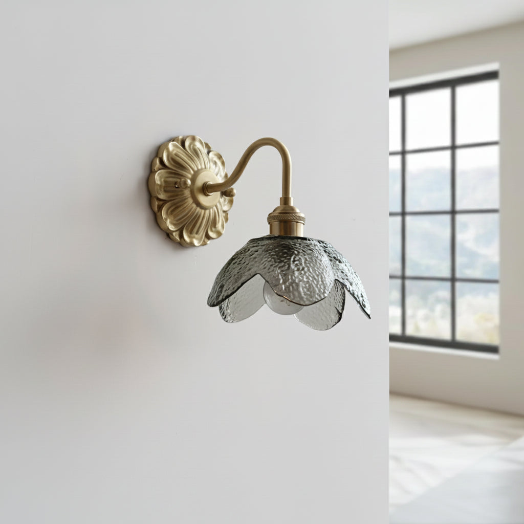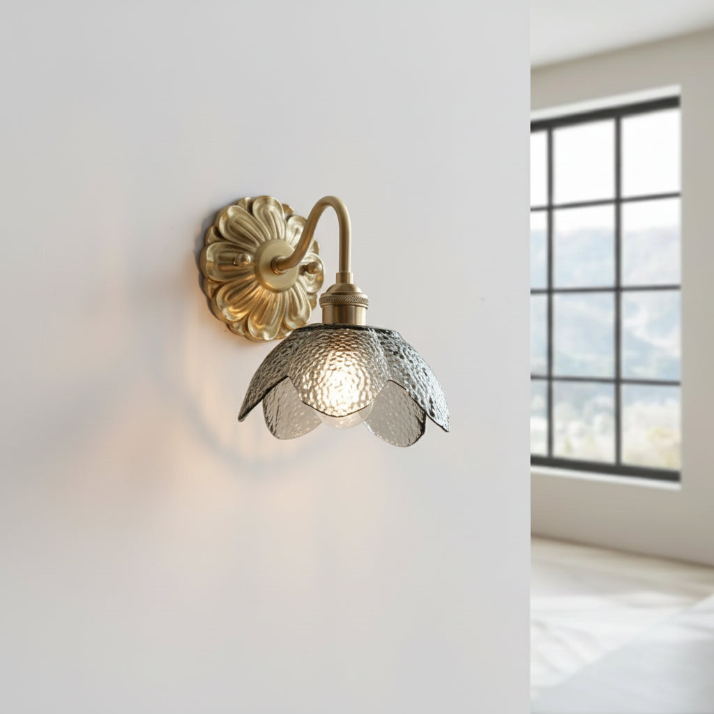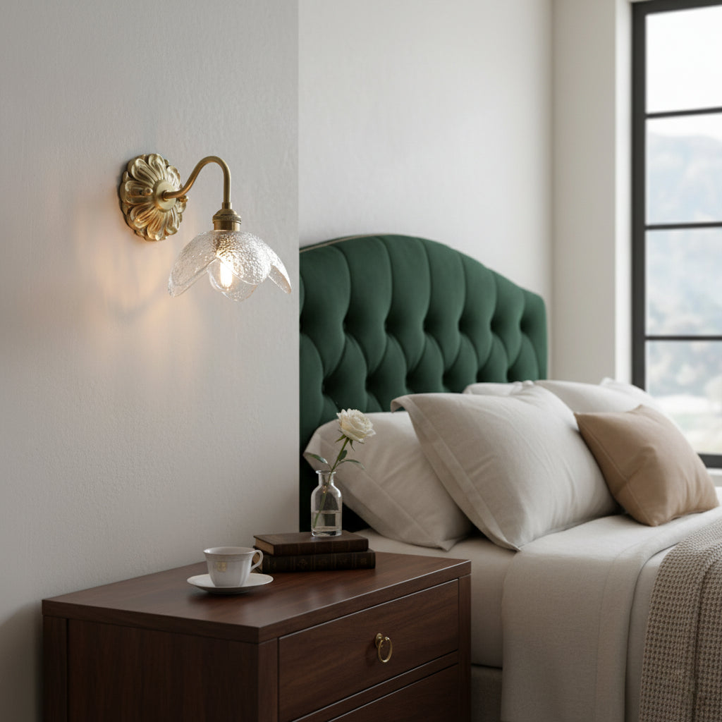 Apportez une touche de romantisme raffiné à votre intérieur avec cette applique murale fleur en cuivre et verre texturé. Son abat-jour délicatement sculpté évoque la forme d’un pétale, diffusant une lumière douce et poétique qui sublime vos murs avec élégance.