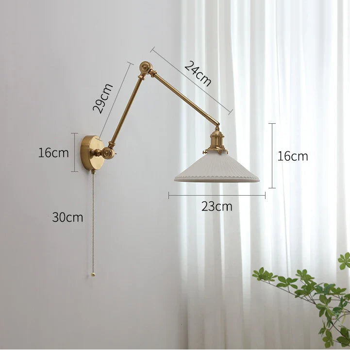 Esta versión destaca por su amplia pantalla plana de cerámica, que difunde la luz de forma generosa y uniforme. Gracias a su brazo ajustable, puedes dirigir la luz a tu gusto, aportando una luz suave y equilibrada a la estancia. El cálido tono latón añade un sutil toque vintage, creando un ambiente elegante y relajante.