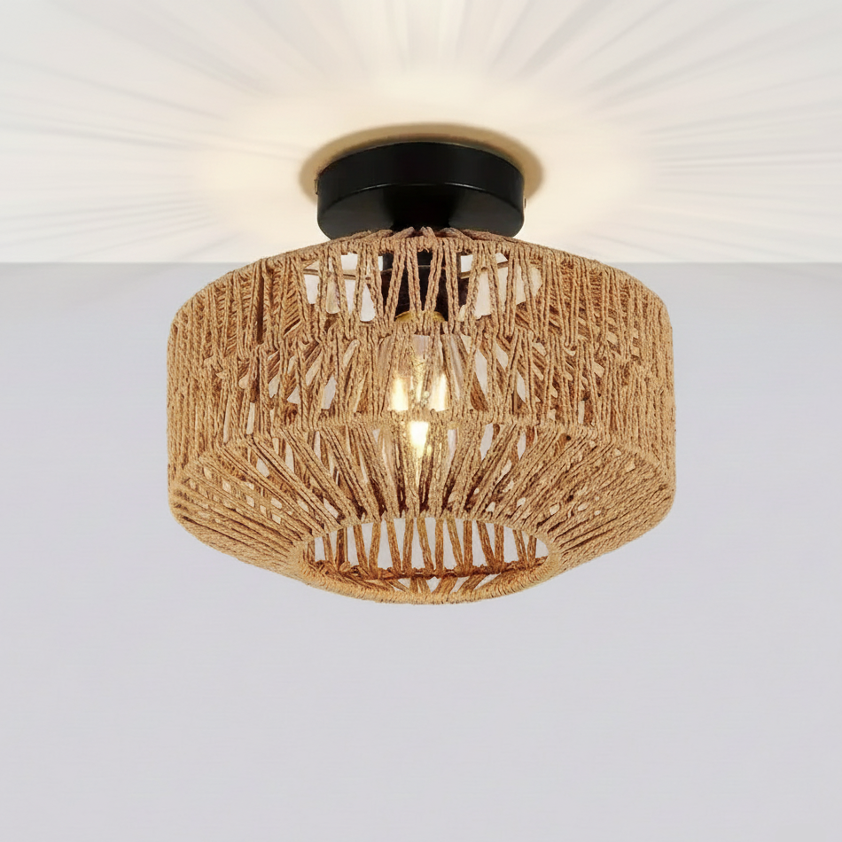 Dale un toque natural y bohemio a tu hogar con la lámpara de techo Bohemian Handwoven Rattan. Su pantalla artesanal, cuidadosamente tejida en ratán, se combina con una estructura metálica para crear una iluminación cálida y elegante.