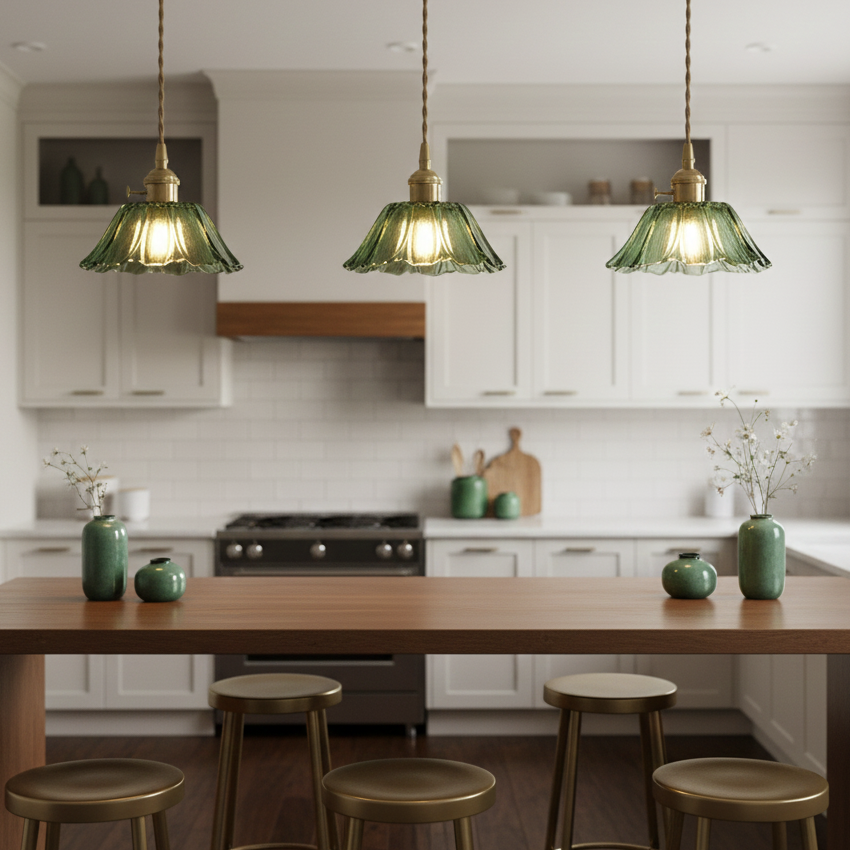Cette suspension diffuse une lumière chaude et scintillante, créant instantanément une atmosphère douce et accueillante. Son abat-jour en verre délicatement ondulé vert capte et diffuse la lumière avec élégance, la laissant glisser en douceur au-dessus d’une table ou d’un petit coin de pièce. Compacte et aérienne, elle apporte une note vintage subtile, renforcée par les fines textures du verre.