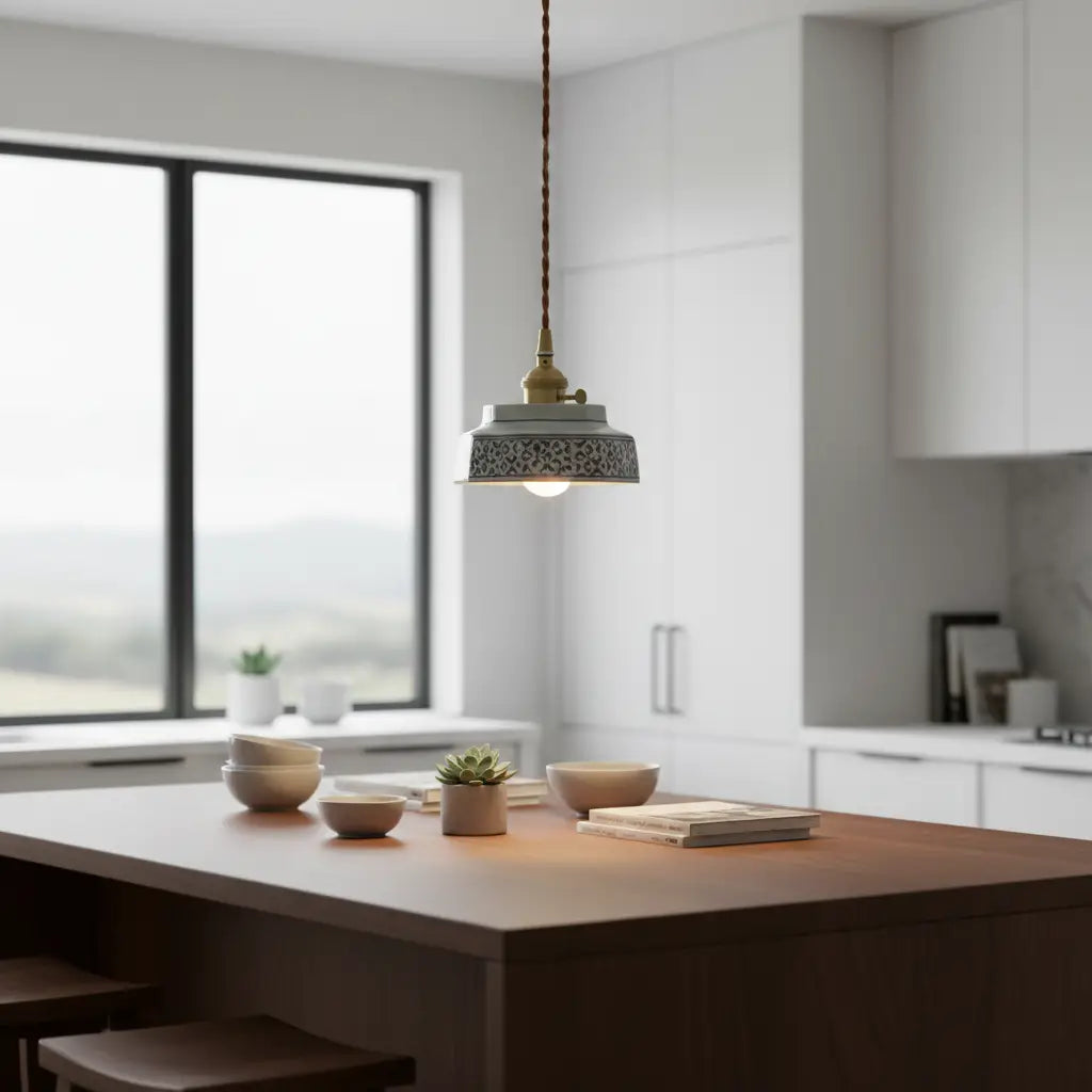 Cette suspension associe une céramique peinte, un ton cuivré chaleureux et une silhouette travaillée avec soin pour créer un véritable point focal décoratif. Son abat-jour plat et généreux diffuse une lumière douce et atmosphérique, qui enveloppe la pièce d’une chaleur subtile. Grâce à son motif délicat, chaque modèle ressemble presque à une pièce artisanale unique, idéale pour ceux qui aiment les luminaires avec caractère et personnalité.